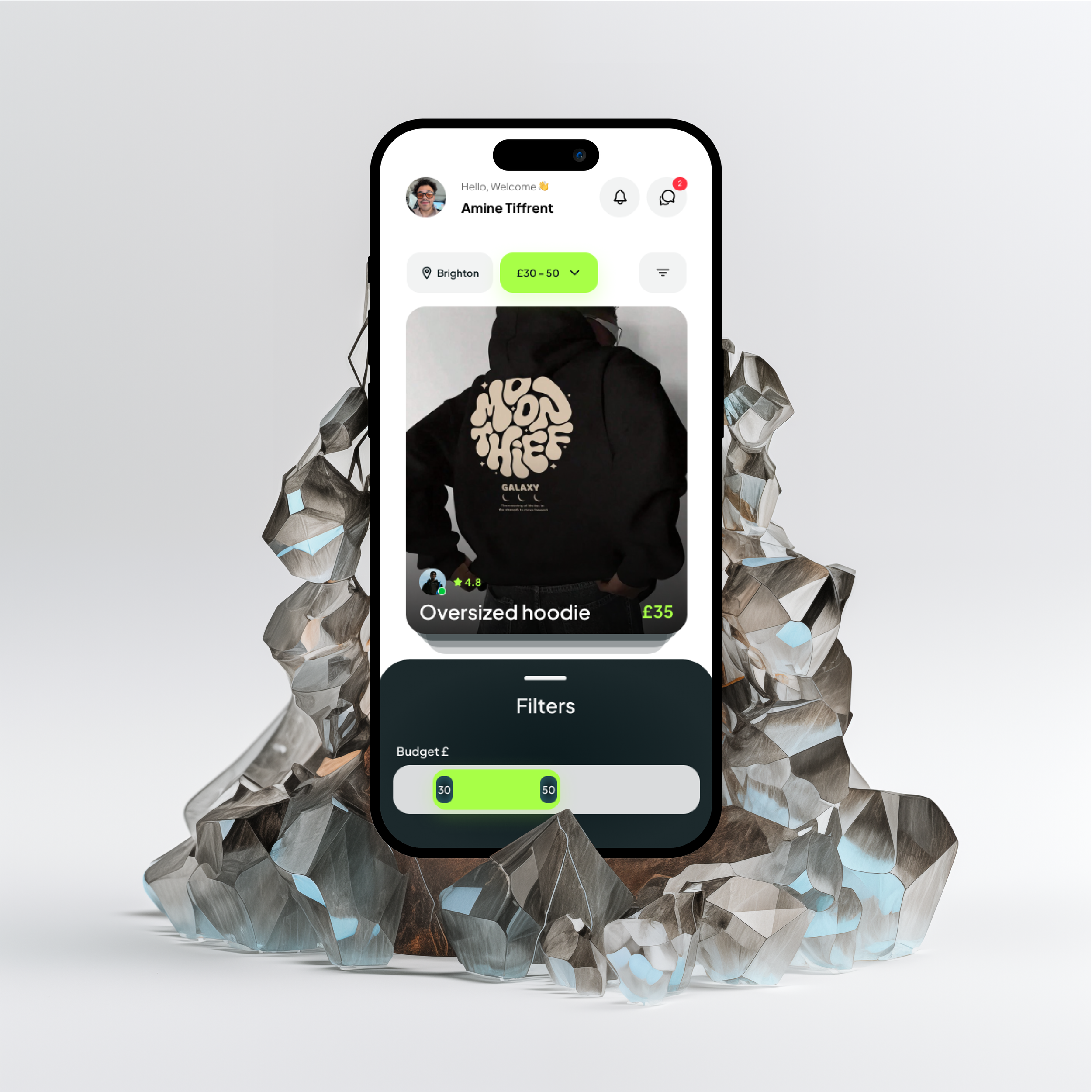 The app combines this gamified interaction with an algorithm-driven personalised feed, capturing style preferences during onboarding and continuously adapting based on swiping behaviour. Robust inline filtering — by brand, price, size, and condition — is accessible without ever leaving the swipe screen, keeping users in flow at all times