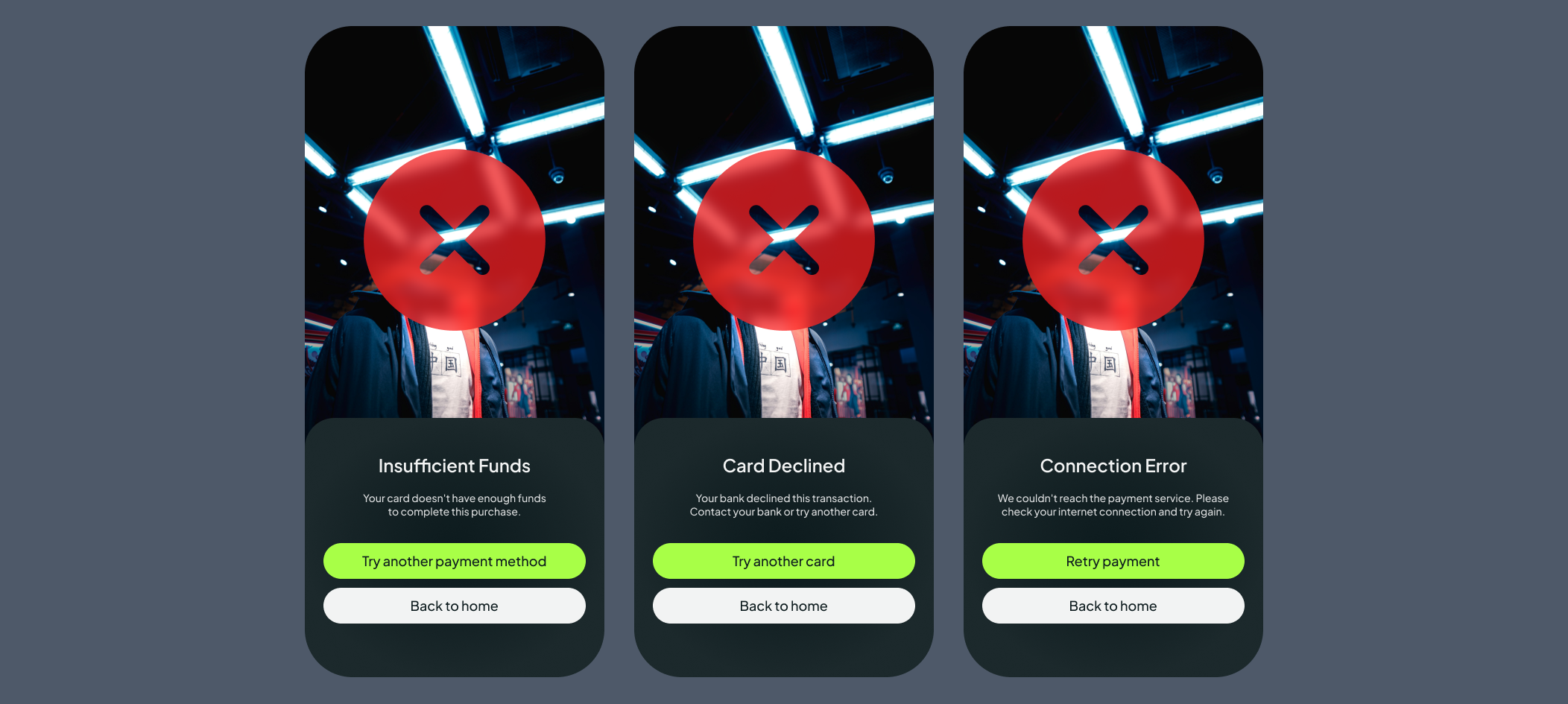 Created 3 distinct error screens tailored to the most common payment failure scenarios